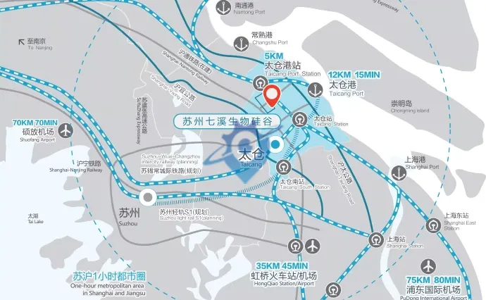 苏州太仓七溪生物硅谷,企业发展大乐土,生物医药新锐显威,美好前程名至实归,园区群星闪耀,咱要奋斗不止步,药械CXO集聚抱团,共创产业名门旺府! 苏州太仓七溪生物硅谷位于太仓市沙溪镇生物医药产业园昭溪路88号,距离上海市40KM。总规划用地400亩,分为一期、二期进行建设,每期用地各200亩。 苏州七溪生物硅谷项目一期总建筑面积超22万平米,包括生物医药研发产业化楼宇近20万平米,以及配套研发办公楼约2万平米。 ★8号地块,占地约130亩,建设20幢厂房和1幢配套办公楼,建筑面积14万平方米,提供CDE三种厂房户型及办公楼,每栋四至五层,层高一楼6.5米,二三层6米,四五层4.5米。 ★2、5号地块,占地约70亩,建筑面积8万平方米,建设13幢标准厂房和2幢配套办公楼,提供AB两种厂房户型及办公楼、每栋四层,层高6米,一层地面承重1.5吨每平方米,2-4层承重0.5吨每平方米。